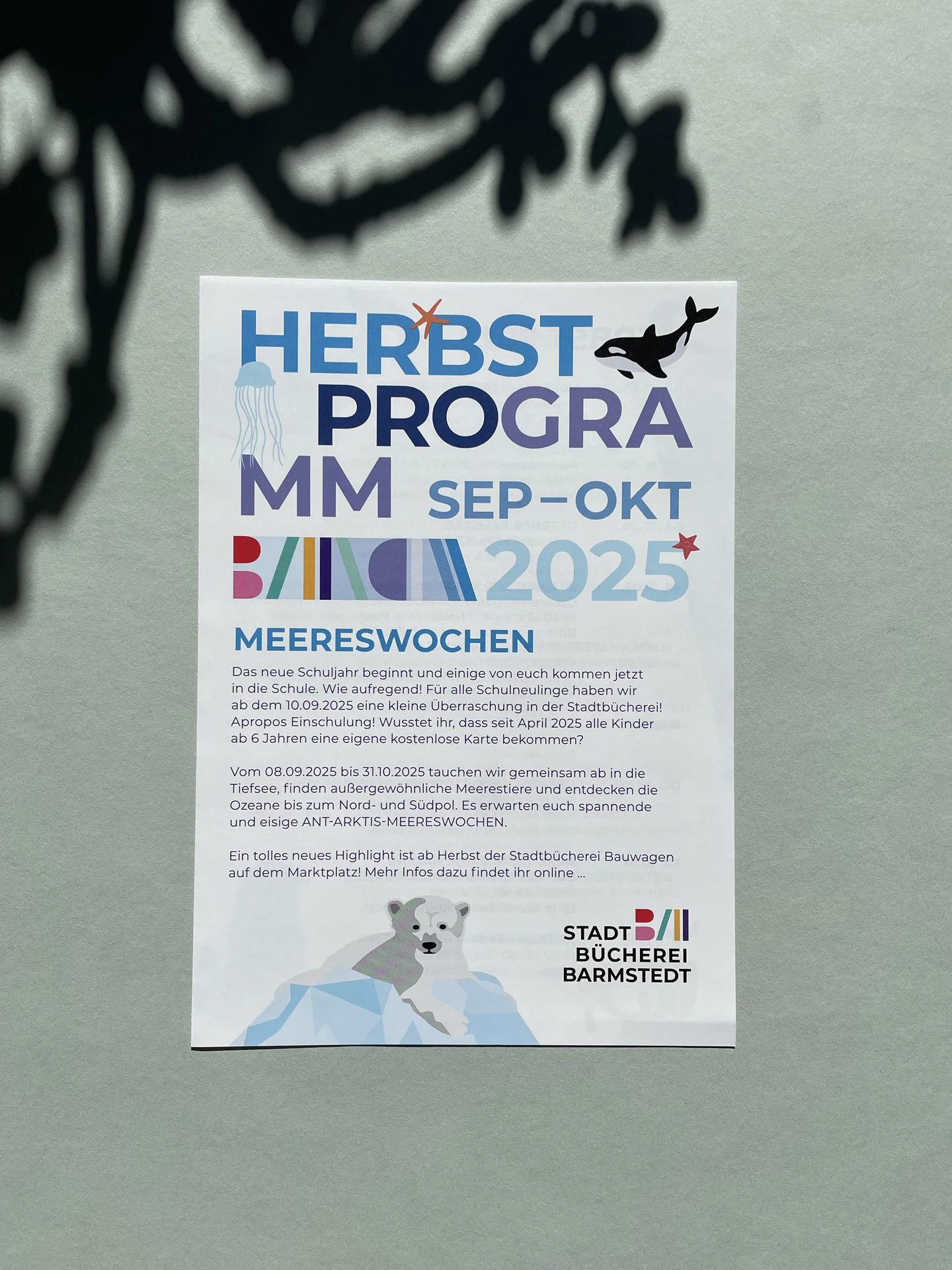 Im Herbst sind in der Stadtbücherei die Meereswochen. Eintauchen, Abtauchen, Entdecken und Treibenlassen. Rund um das Thema Meer, Antarktis und Arktis, Entdecker:innen der Geschichte, Tiere im Meer, und viele neue Begegnungen können die Kinder in diesen spannenden Wochen erleben.