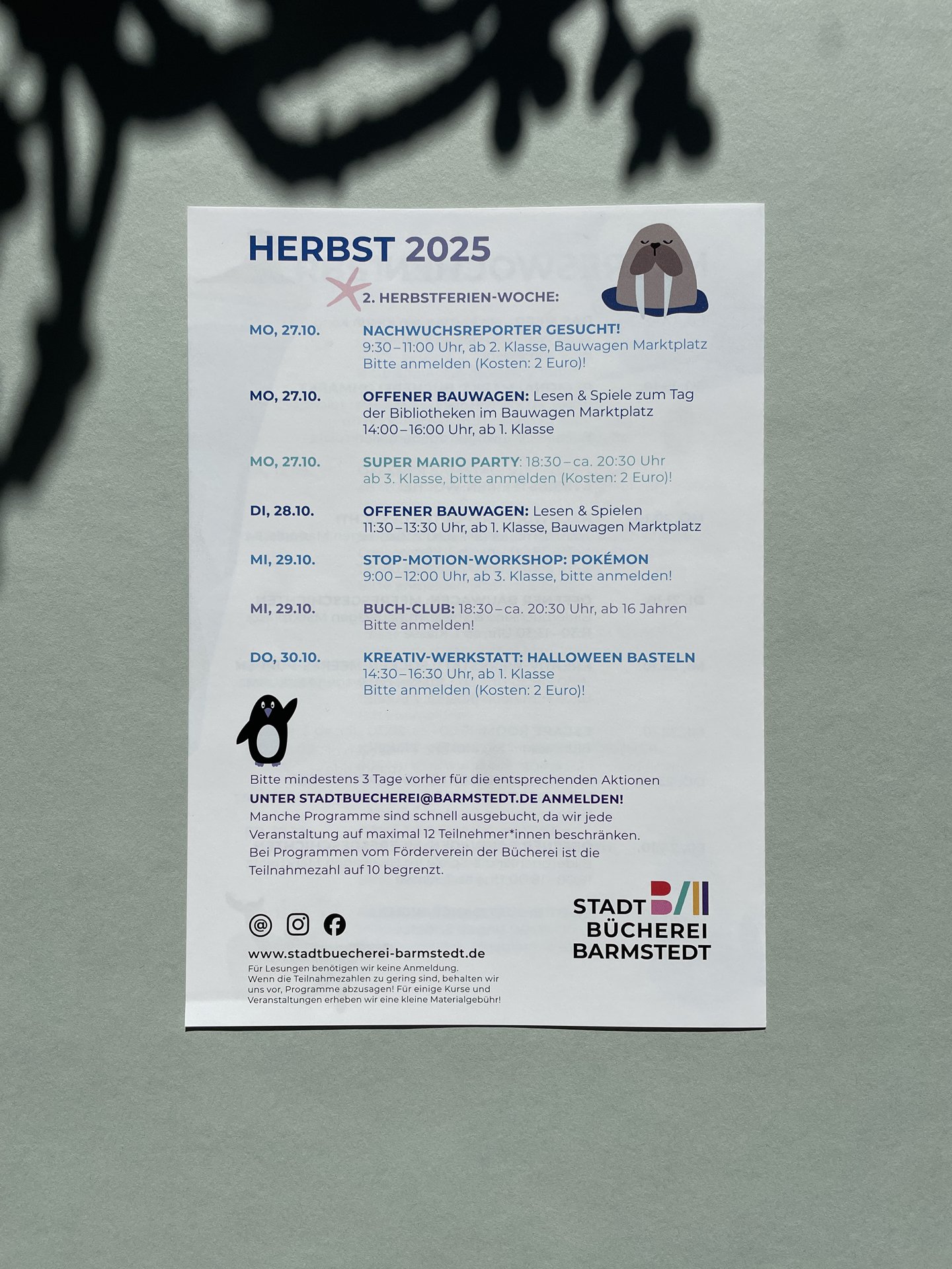 Die Programm-Flyer der Stadtbücherei Barmstedt sind bunt gefüllt an verschiedenen Lesungen, Workshops, Kunst-Kurse, Aktionen und thematisch wechselnden Programmen, die übers ganze Jahr kreativ und vielfältig wechselnd sind.